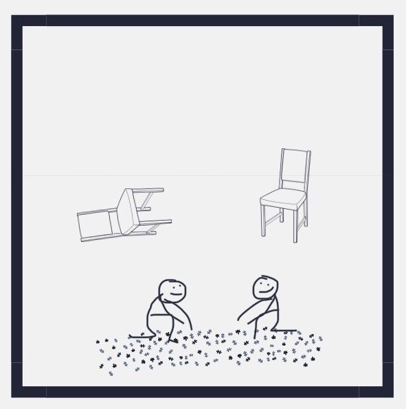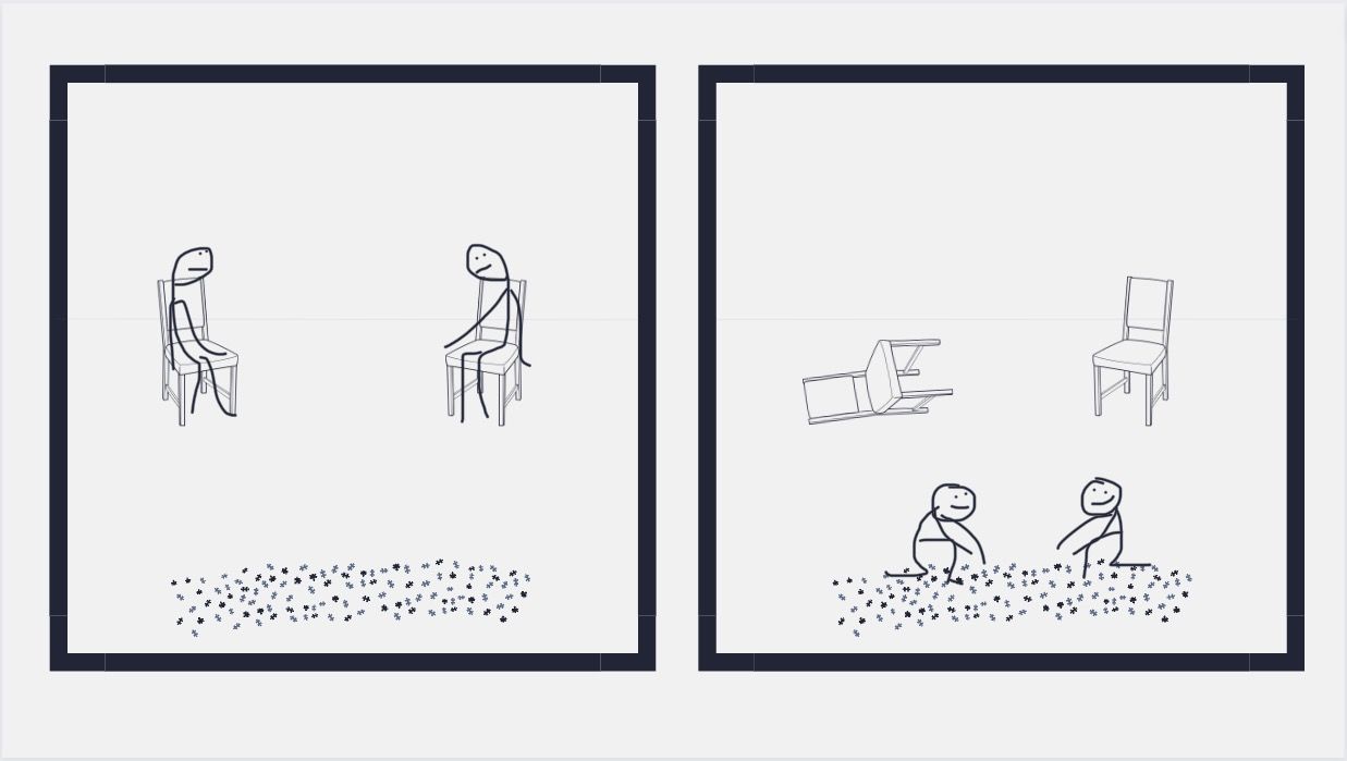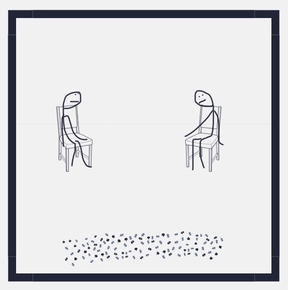 Hay dos personas en una habitación. Están sentadas en sus sillas, con tal desgano que parecen a punto de deslizarse al piso, como si la gravedad se aprovechara de su apatía. En una esquina de la habitación descansa un rompecabezas desarmado, representando un desafío considerable pero, con esfuerzo, posible de resolver.