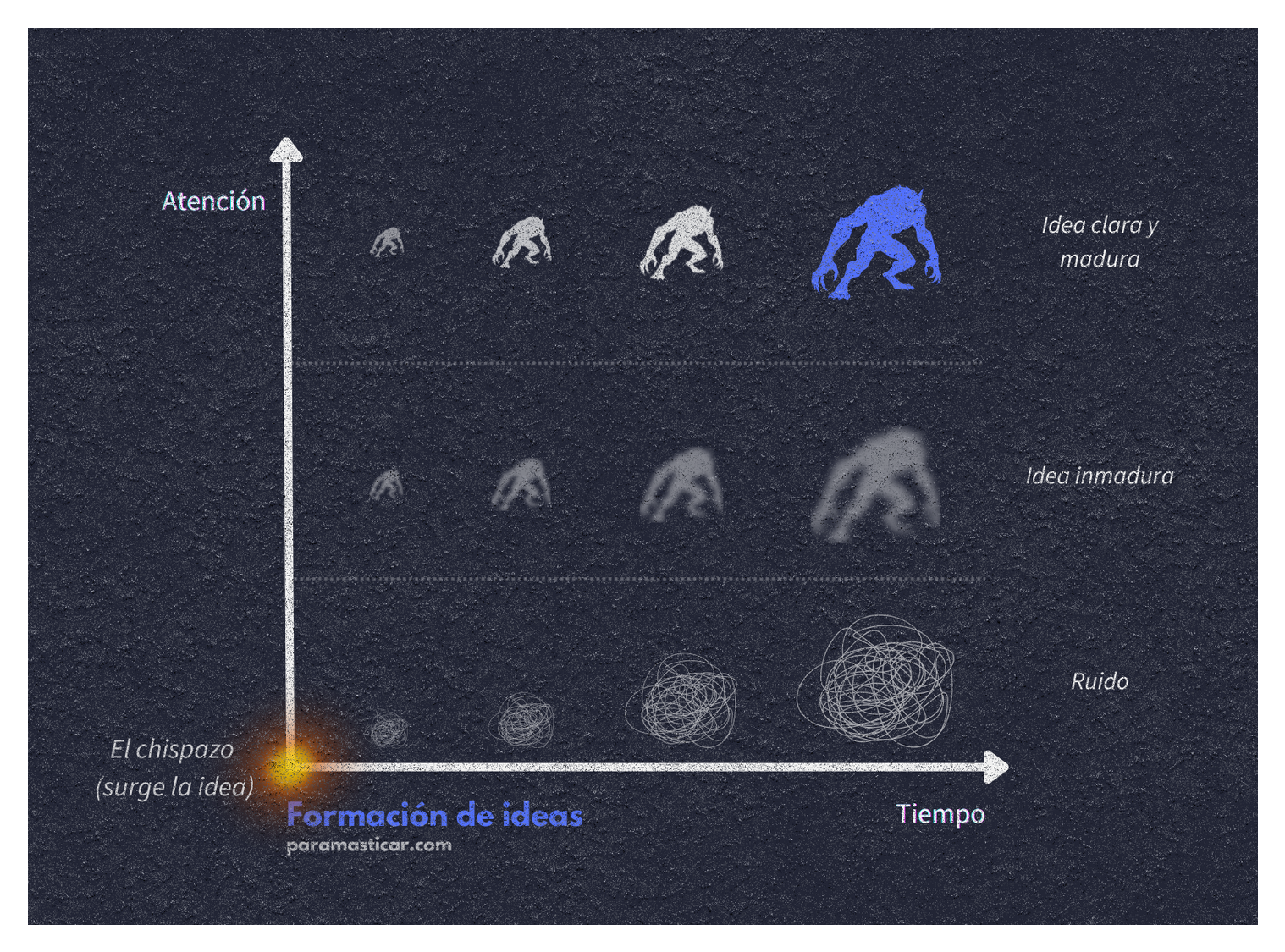 Esas extensiones de la metáfora son imposibles de generar “de una”. Decir “hoy voy a desarrollar un concepto nuevo y lo voy a comunicar por completo” no existe. Para tomar fuerza, una idea necesita tres cosas: tiempo, atención y paciencia.
